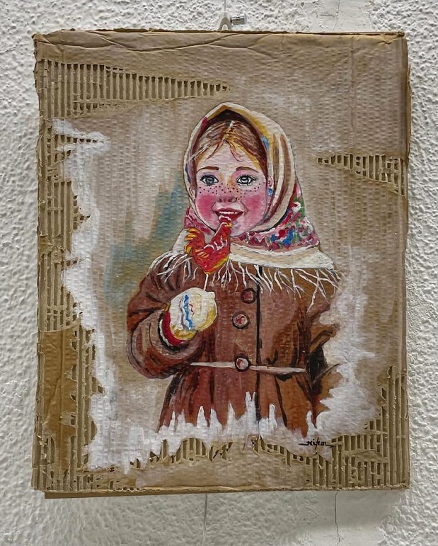 Halı üzerine tamamen kendi tekniklerimle tablolar yaptım. Diğer tarafta sıfır atık projesi kapsamında kartonları değerlendirerek özgün tasarımlar üzerine çalıştım.’’
