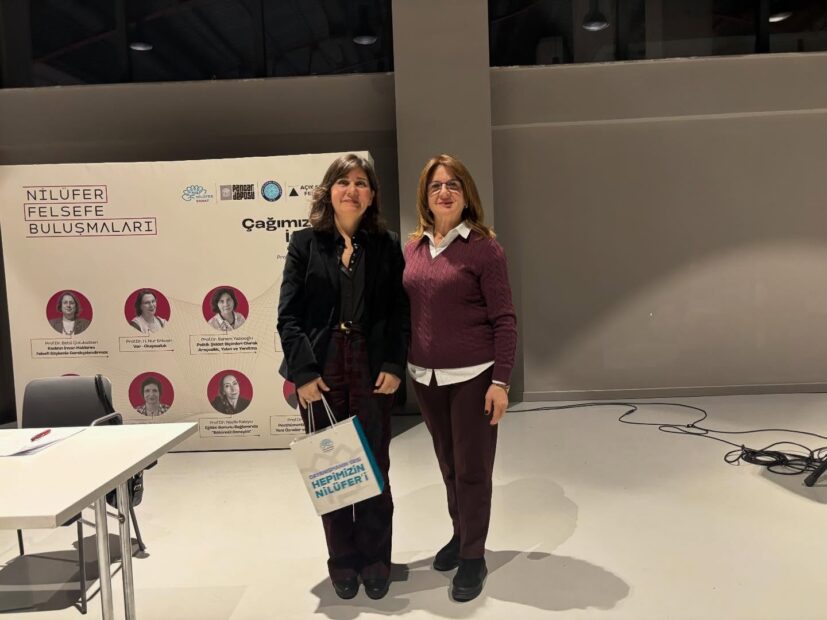 Söyleşinin sonunda Nilüfer Belediye Başkanı Şadi Özdemir’in eşi Nuray Özdemir, günün anısına Prof. Dr. Sanem Yazıcıoğlu’na hediye verdi.
