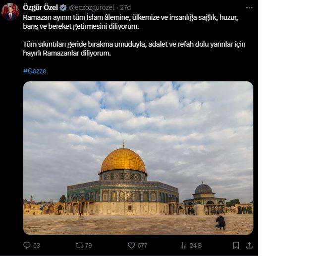 Özel, sosyal medya hesabından Mescidi Aksa’nın fotoğrafını paylaşarak, şu ifadeleri kullandı: “Ramazan ayının tüm İslam âlemine, ülkemize ve insanlığa sağlık, huzur, barış ve bereket getirmesini diliyorum. Tüm sıkıntıları geride bırakma umuduyla, adalet ve refah dolu yarınlar için hayırlı Ramazanlar diliyorum.”