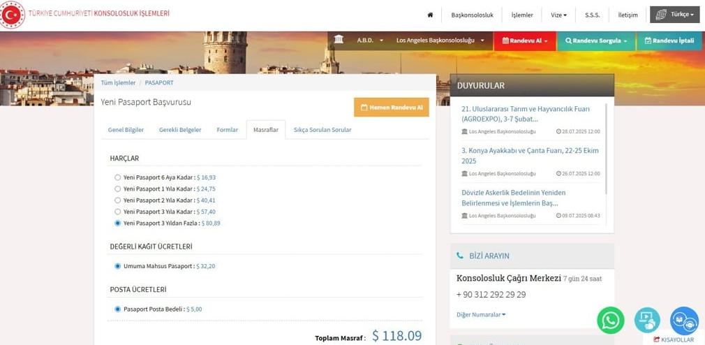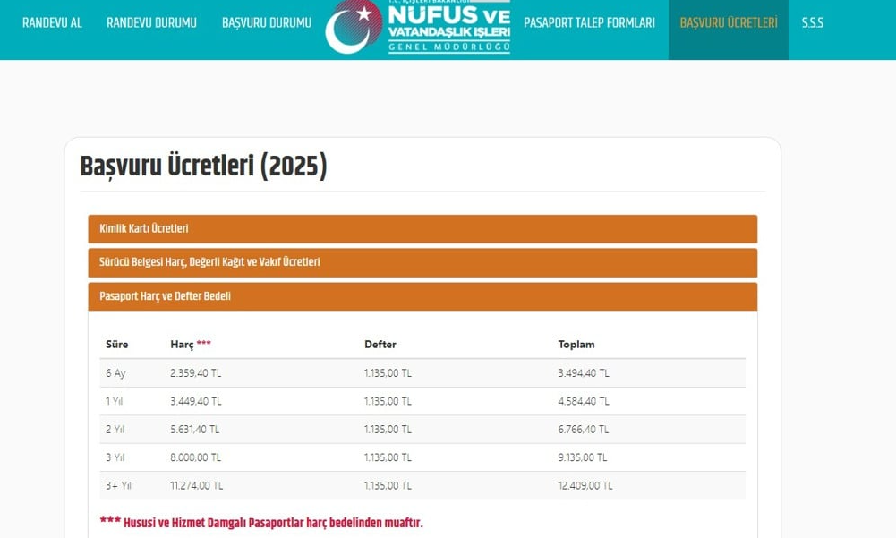 Türkiye’de İçişleri Bakanlığı’na bağlı Nüfus ve Vatandaşlık İşleri Genel Müdürlüğü’nden alınan pasaport randevularında bugün itibariyle defter bedeli olarak bin135 TL ödeme yapılması gerekiyor. Harç bedeli ise süreye bağlı olarak değişiklik gösteriyor. 6 aylık bir pasaport başvurusu için 3 bin 494 lira, 2 yıl için 6 bin 766 lira ve 3 yıldan uzun süreler için toplam 12 bin 409 lira ödeniyor.