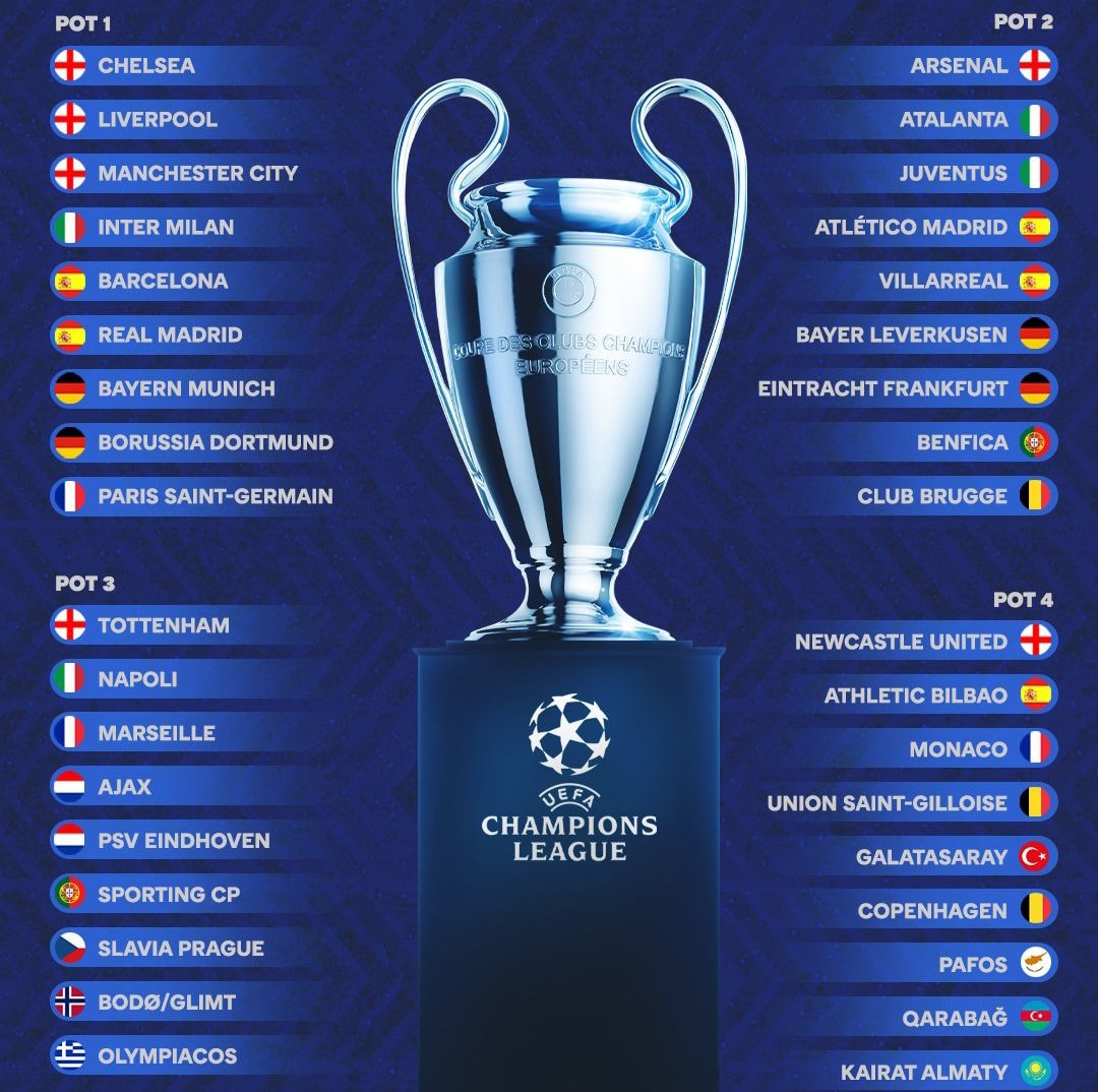 Bu sezon 36 takım yer alıyor ancak klasik gruplar kaldırıldı. Her ekip sekiz maç oynayacak; dördü iç sahada, dördü deplasmanda. Ocak ayında 25 ila 36. sırada kalan takımlar Avrupa’ya veda edecek. Kura çekiminde her takım, her torbadan iki rakiple eşleşecek. Bu rakiplerden biriyle evinde, diğeriyle deplasmanda karşılaşacak. Aynı ülke takımlarının eşleşmesi kural olarak engellenirken, bir kulüp en fazla aynı ülkeden iki rakiple karşılaşabilecek.