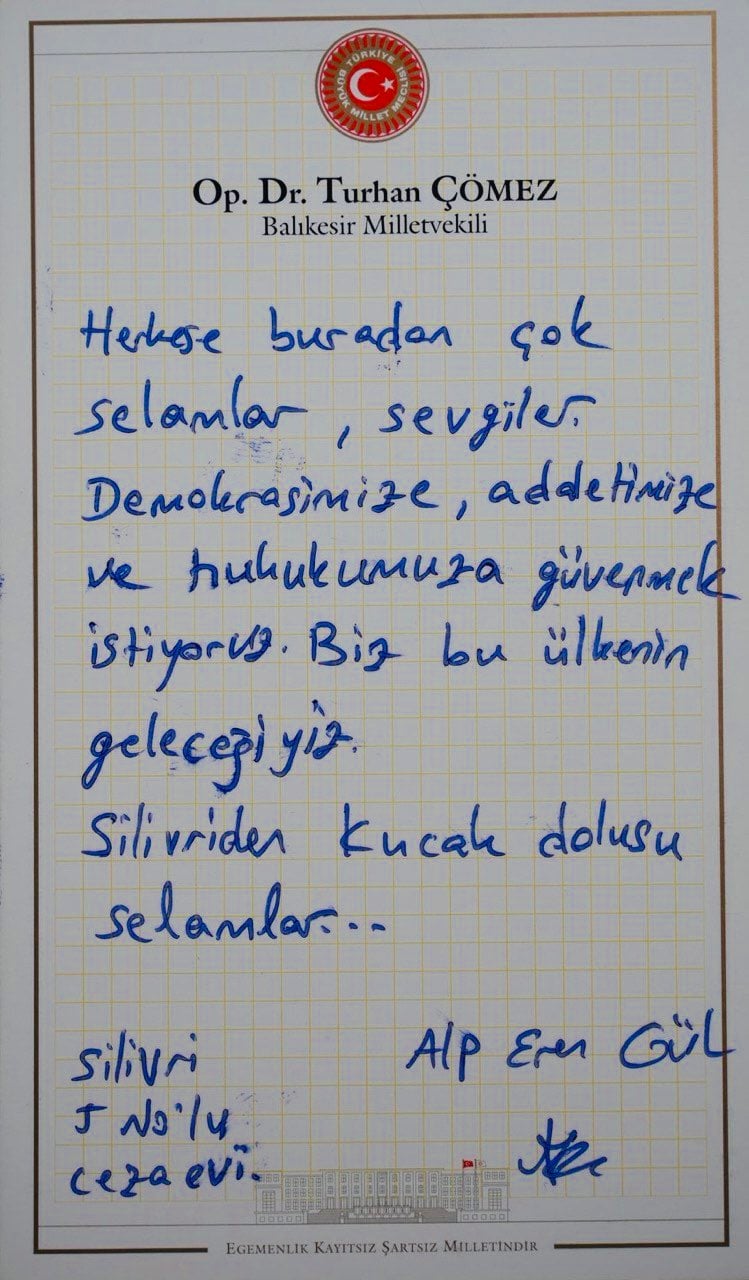 İYİ Parti Grup Başkanvekili Turhan Çömez, dün gerçekleştirdikleri Silivri cezaevi ziyaretinde eylemlere katıldığı için tutuklanan üniversite öğrencileri Narsay Ergün ile Alp Eren ve “Her şey çok güzel olacak” sloganının mimarlarından Berkay Gezgin ile görüştü.
