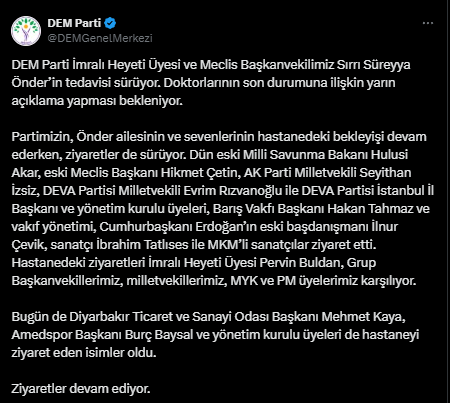 DEM Parti bugün sosyal medya hesabından yaptığı açıklamada Önder’in sağlık durumu hakkındaki son gelişmelerin yarın doktorları tarafından açıklanacağı ifade edildi.