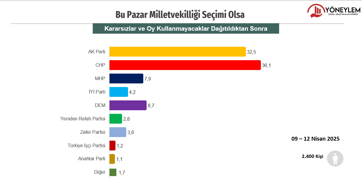 Kararsızlıklar dağıtıldıktan sonra ise CHP’nin yüzde 36,5 ile birinci parti olduğu görüldü.