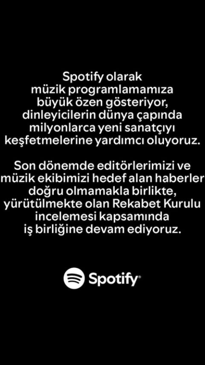 “Dinleyicilerin dünya çapında milyonlarca yeni sanatçıyı keşfetmelerine yardımcı oluyoruz. Son dönemde editörlerimizi ve müzik ekibimizi hedef alan haberler doğru olmamakla birlikte, yürütülmekte olan Rekabet Kurulu incelemesi kapsamında iş birliğine devam ediyoruz.”