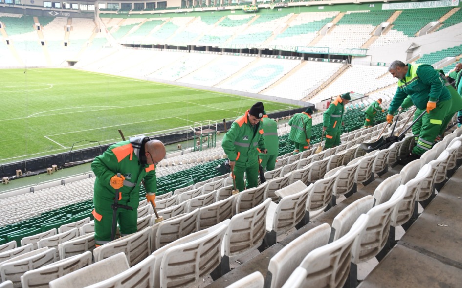 Osmangazi Belediyesi Temizlik İşleri Müdürlüğü ekipleri, bu hafta oynanan ve Bursaspor’un 2-0 kazandığı Ergene Velimeşespor karşılaşmasının ardından temizlik çalışması gerçekleştirdi. Stadyum çevresinde, koridorlarda ve tribünlerde iki gün boyunca temizlik çalışması yürüten ekipler, 43 bin 361 kişi kapasiteli dev stadyumu baştan aşağı temizleyerek bir sonraki karşılaşma için hazır hale getirdi.