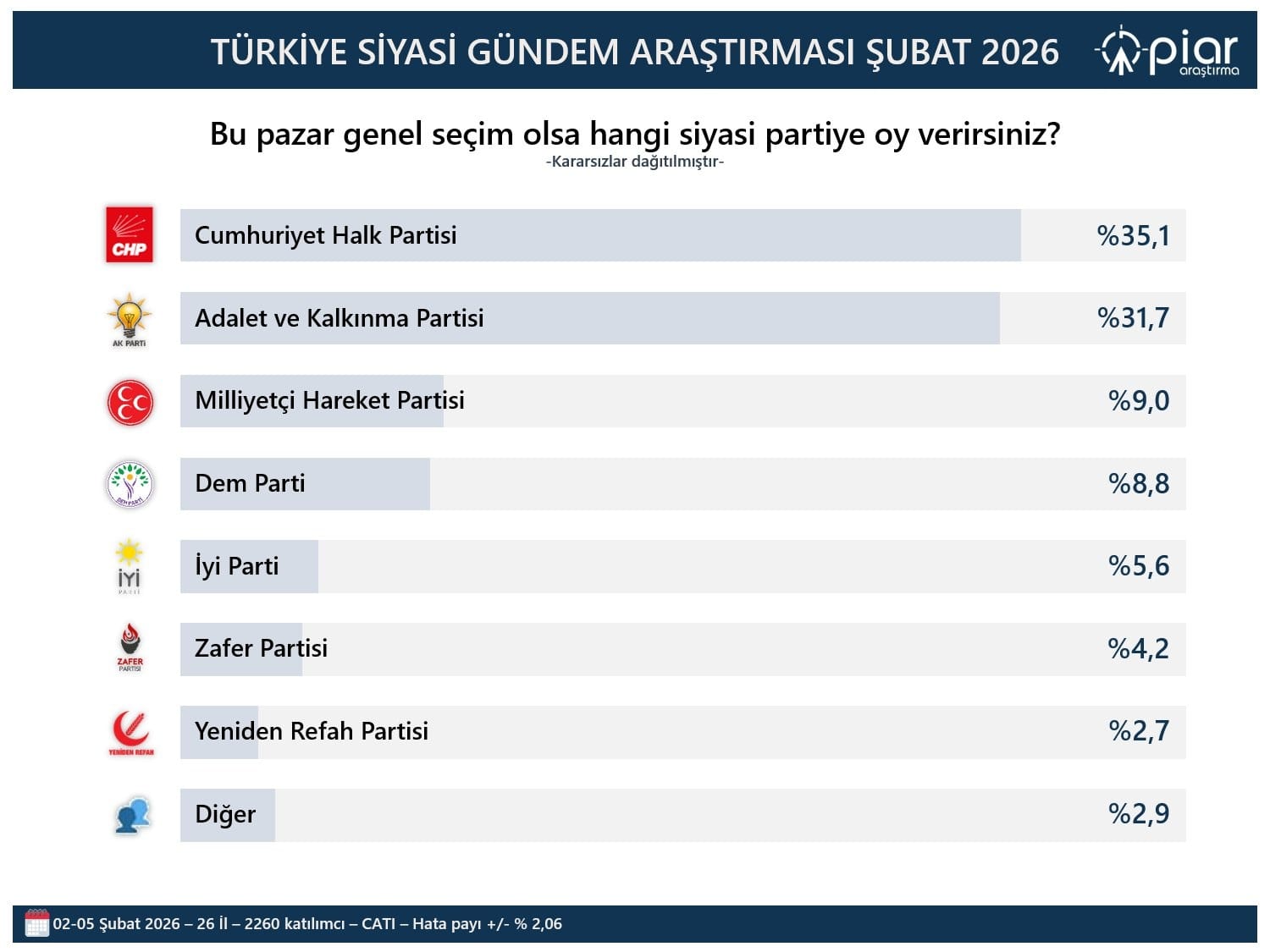 PİAR Araştırma’nın Şubat 2026 “Türkiye Siyasi Gündem Araştırmasına göre, bu pazar genel seçim yapılması ihtimalince CHP yüzde 35,1 ile birinci parti olurken, AKP yüzde 31,7 ile ikinci sırada yer aldı.