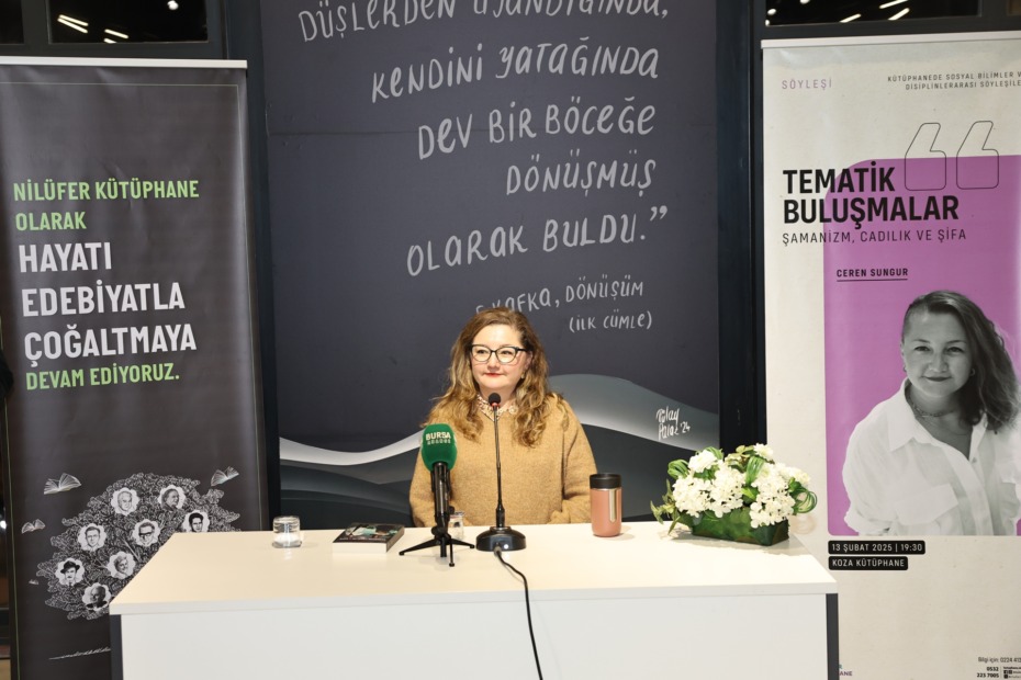 Nilüfer Belediyesi’nin düzenlediği “Tematik Buluşmalar: Kütüphanede Sosyal Bilimler ve Disiplinlerarası Söyleşiler” programının bu ayki konuğu, “Şamanizm, Cadılık ve Şifa” kitabının yazarı Ceren Sungur oldu. Koza Kütüphane’de gerçekleştirilen ve yoğun ilgi gören söyleşide Sungur, Şamanizm’in tarihi, modern tıp ile ilişkisi ve günümüzdeki yansımalarını anlattı.