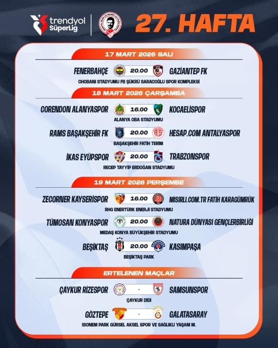 21.01.2026 tarihinde Trendyol Süper Lig 27. hafta müsabakalarının tarihlerinde değişiklik yapıldığına ilişkin açıklamada belirtildiği üzere, Galatasaray ve Samsunspor kulüplerimizin UEFA Şampiyonlar Ligi ve UEFA Konferans Ligi’nde Son 16 Turuna yükselmiş olmalarından dolayı, Göztepe – Galatasaray ile Çaykur Rizespor – Samsunspor Trendyol Süper Lig 27. Hafta müsabakaları ileri bir tarihe ertelenmiştir. Müsabakaların oynanacağı tarihler daha sonra ilan edilecektir.” ifadeleri kullanıldı.