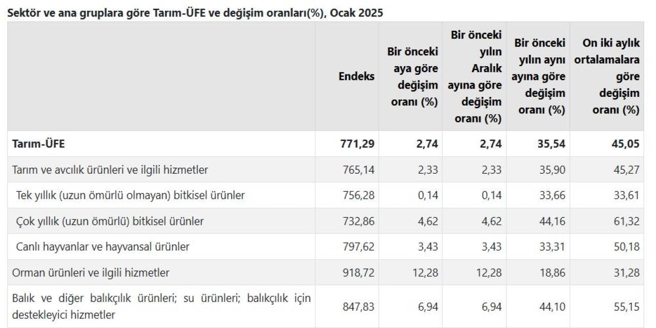 2024 yılı enflasyonunu ise yüzde 44,38 olarak açıklayan TÜİK, Ocak 2024 dönemine ilişkin tarım ürünleri üretici fiyat endeksi verilerini de açıkladı.