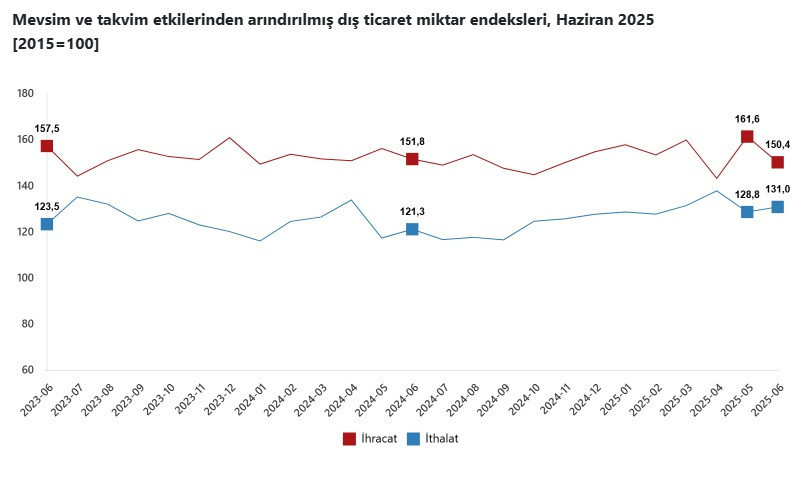 Mevsim ve takvim etkilerinden arındırılmış verilere göre, ihracat miktar endeksi Mayıs 2025’e kıyasla yüzde 6,9 azalarak 150,4 oldu.