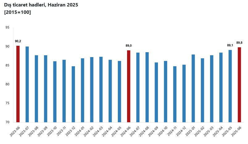 İhracat birim değer endeksinin ithalat birim değer endeksine bölünmesiyle hesaplanan dış ticaret haddi, Haziran 2024’teki 89,0 seviyesinden 0,8 puan artarak 89,8’e çıktı.