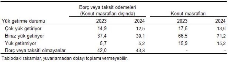 Geçen yıl ile kıyaslandığında, konut alımı ve konut masrafları dışında borç veya taksit ödemesi olanların oranı 1,2 puan azalarak %56,8 olmuştur. Nüfusun %5,2’si bu ödemelerin kendilerine yük getirmediğini belirtirken, %39,1’ine bu ödemelerin biraz yük getirdiği ifade edilmiştir. %12,5’ine ise bu ödemelerin çok büyük bir yük oluşturduğu görülmüştür. Konut masraflarının çok yük getirdiği hanelerin oranı %13,6 olarak saptanırken, konut masraflarının biraz yük getirdiği hanelerin oranı ise %71,2 olarak kaydedilmiştir. Konut masraflarının yük getirmediğini belirten hanelerin oranı ise geçen yıla göre 0,7 puan azalarak %15,2’ye düşmüştür.