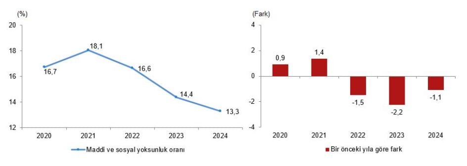 Yukarıda belirtilen on üç maddenin en az yedisini karşılayamayan bireylerin oranı, 2023 yılında %14,4 iken 2024 yılı sonuçlarında 1,1 puan azalarak %13,3 olarak tahmin edilmektedir.