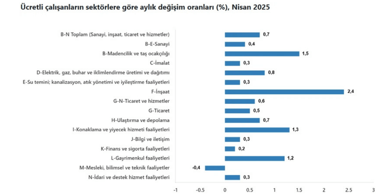 Nisan ayında, bir önceki aya göre ücretli çalışan sayısında %0,7 oranında artış yaşandı.