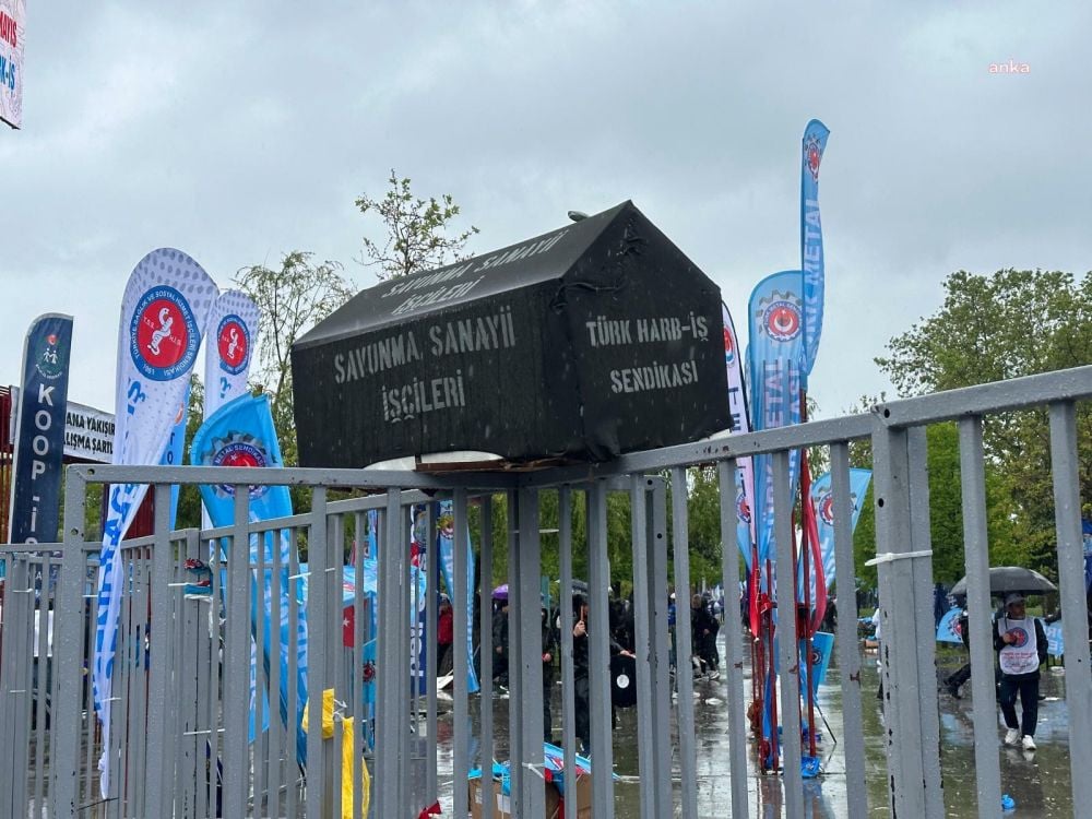 Mitingin sona ermesinin ardından bir grup savunma sanayi işçisi, podyum ile mitinge katılan vatandaşları ayıran demir bariyerlerin üzerine “Savunma Sanayii İşçileri” yazılı siyah bir tabut bıraktı.