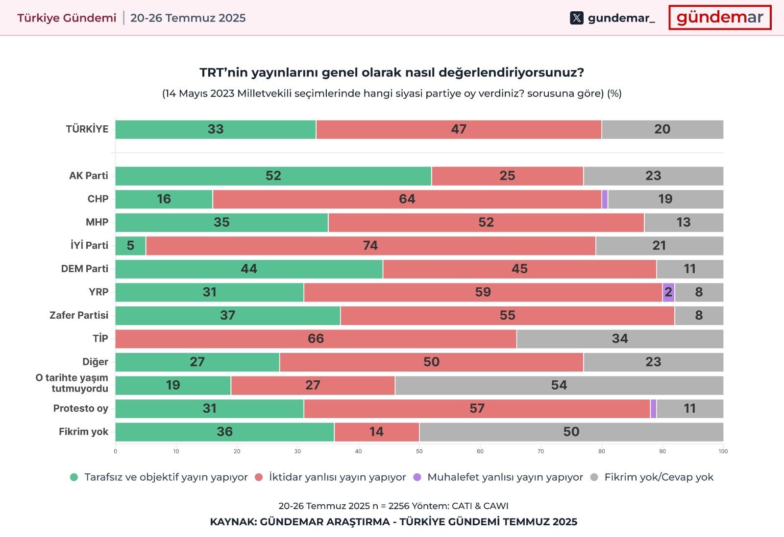 “TRT yayınlarını genel olarak nasıl değerlendiriyorsunuz” sorusuna katılımcıların yalnızca üçte biri, yüzde 33’ü “TRT’nin tarafsız ve objektif yayın yaptığını” belirtirken, katılımcıların yaklaşık yarısı, yüzde 47’si “TRT’nin iktidar yanlısı yayın yaptığını” belirtti.“Fikrim yok / Cevap yok” diyenlerin oranı ise yüzde 20 oldu.