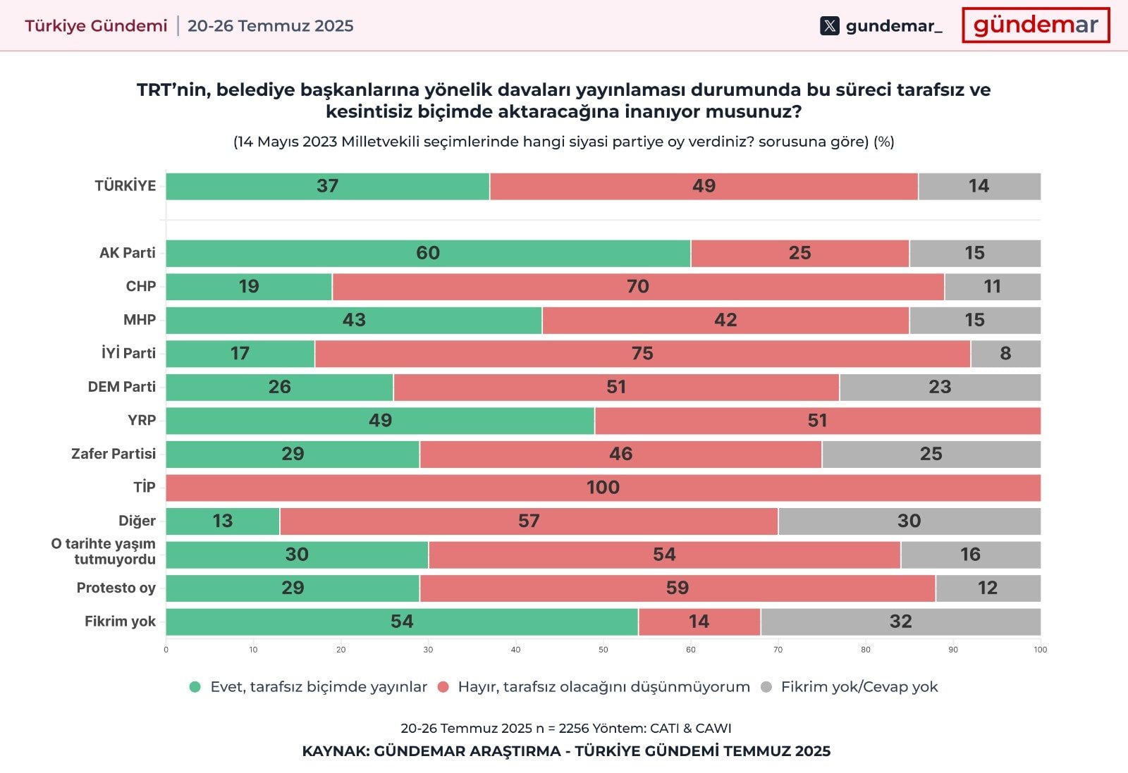 “TRT, belediye başkanlarına yönelik davaları yayınlaması durumunda bu süreci tarafsız ve kesintisiz biçimde aktarır mı?” sorusunda katılımcıların yalnızca yüzde 37’si “evet” derken, yüzde 49’u “TRT’nin böyle bir süreçte taraflı yayın yapacağına” inanıyor.