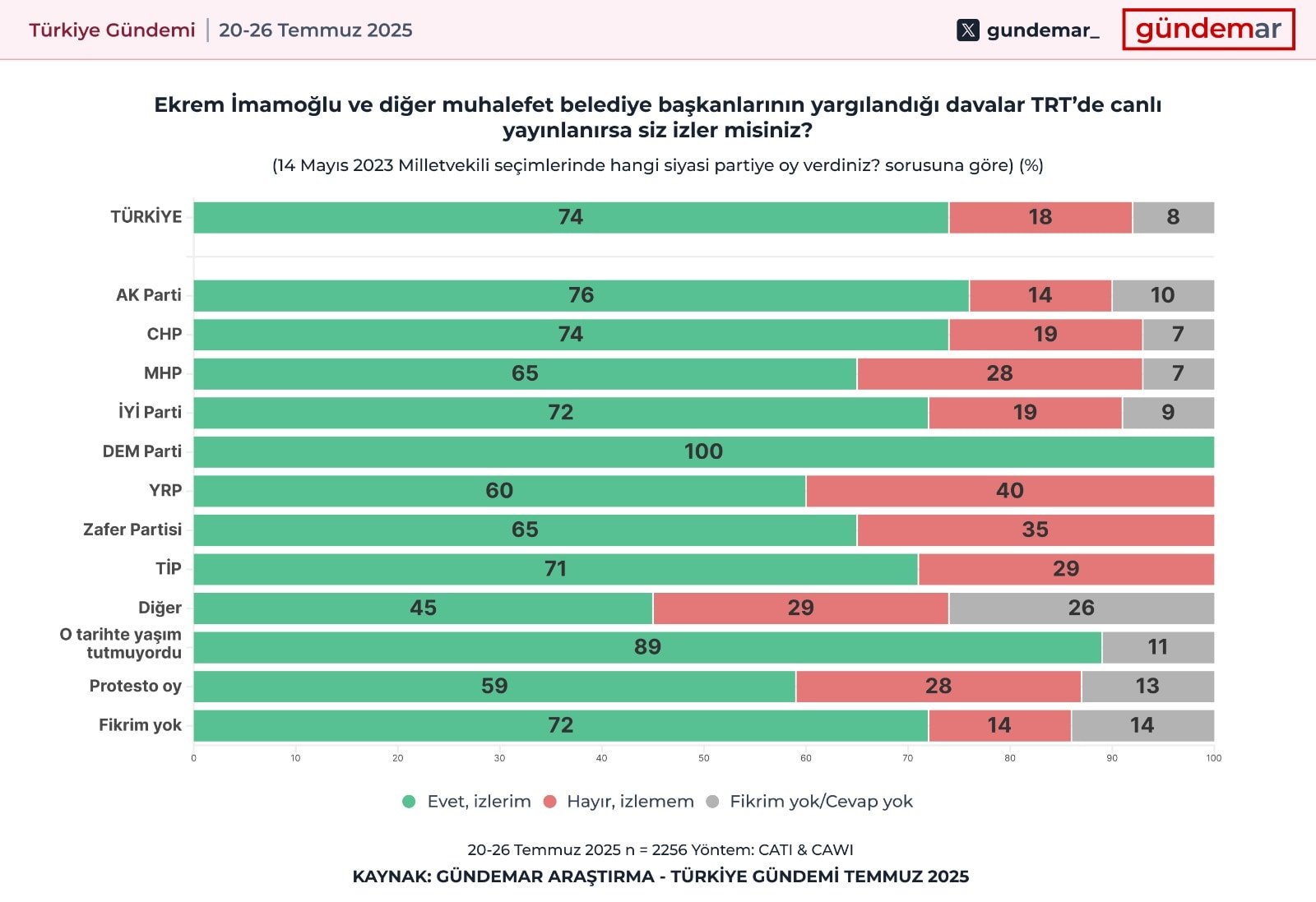 CHP seçmenin yüzde 69’unun, İYİ Parti seçmenin yüzde 81’inin, DEM Parti seçmenin yüzde 80’inin, AKP seçmeninin 66’sının, MHP seçmeninin de yüzde 64’ünün “duruşmalar canlı yayınlansın” dediği görüldü..