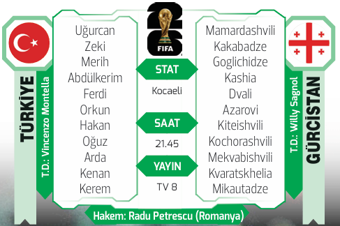 AY-Yıldızlı ekipte iki maçlık cezası sona eren Barış Alper Yılmaz, Gürcistan’a karşı forma giyebilecek. Sakatlığı nedeniyle kadrodan çıkarılan İrfan Can Kahveci’nin yanı sıra kampı terk eden Berke Özer’den yoksunuz… Berke’nin yeri ne Başakşehir’den Muhammed Şengezer kadroda.