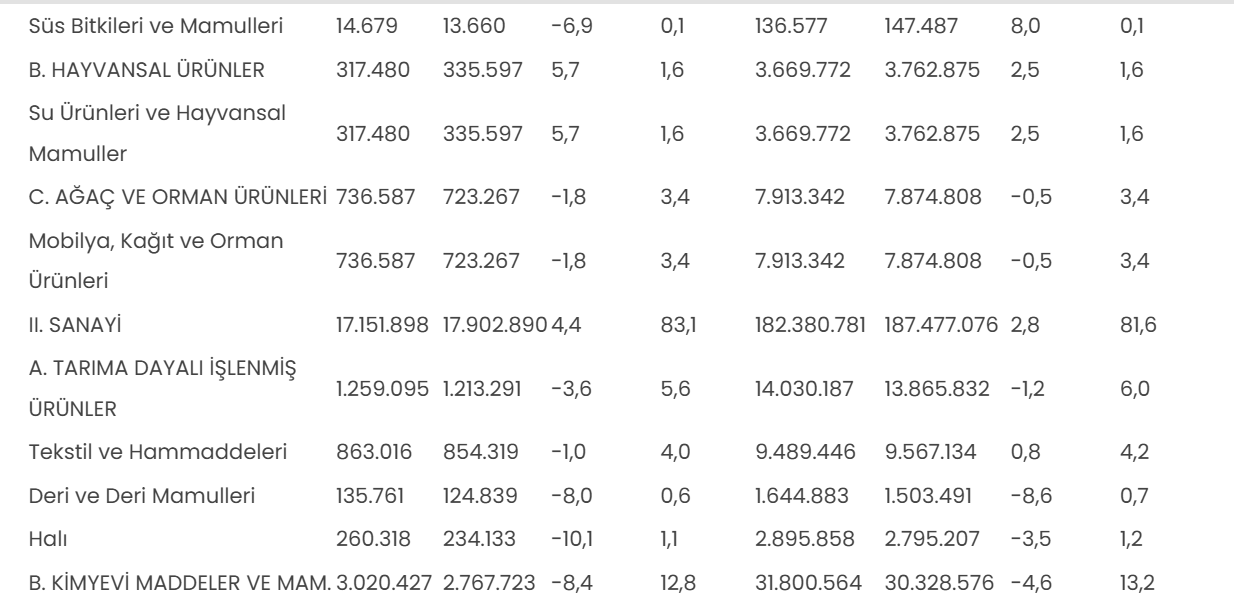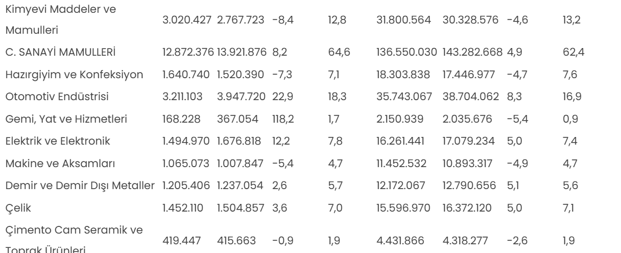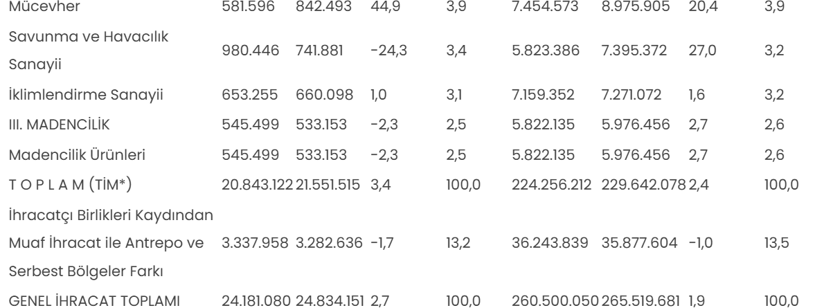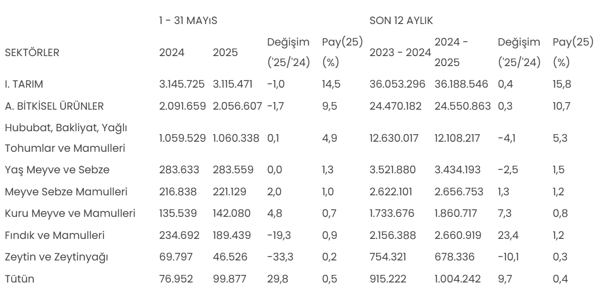 TİM verilerine göre, sektörel bazda 2024 ve 2025’in mayıs ayları ve son 12 aylık ihracat verileri, değişim oranları ve toplam içindeki payları şöyle (bin dolar):