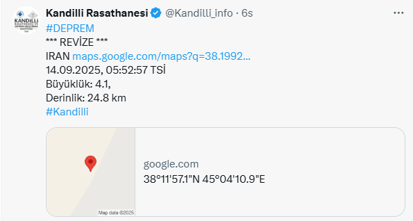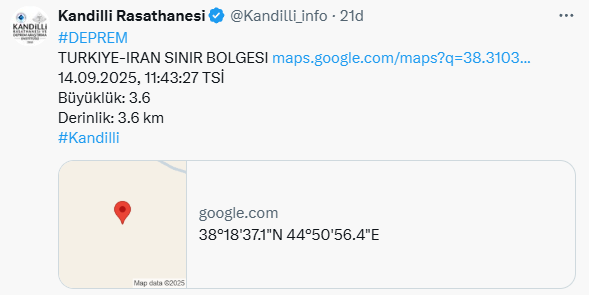 Kandilli Rasathanesi, Türkiye-İran sınırında saat 11.43 itibari ile üç depremin meydana geldiğini ifade etti. İlk deprem bugün saat 05.52’de yerin 24 kilometre derinliğinde meydana gelirken depremin büyüklüğü 4,1 olarak kaydedildi. Kandilli Rasathanesi’nin sabah saatlerinde yaptığı ilgili paylaşım şu şekilde: