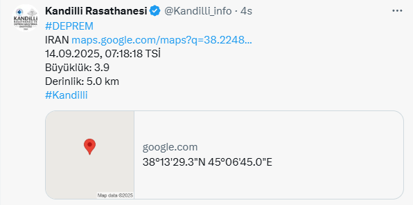 Bu depremden henüz 2 saat geçmemişken İran merkezli bir deprem daha oldu. Bu defa deprem saat 07,18’de yerin 5 kilometre derinliğinde 3,9 büyüklüğünde oldu. Kandilli Rasathanesi’nin ikinci depreme ilişkin paylaşımı şu şekilde: