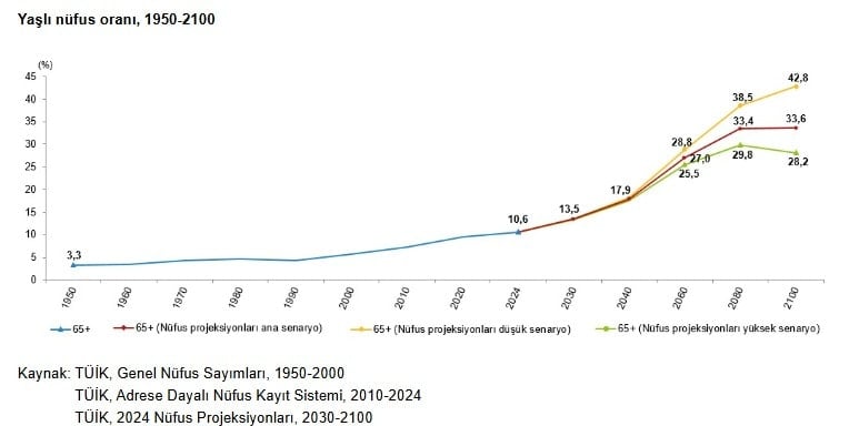 Nüfus projeksiyonlarının demografik göstergelerdeki mevcut yapının devam edeceğini varsayan ana senaryosuna göre yaşlı nüfus oranının 2030 yılında yüzde 13,5, 2040 yılında yüzde 17,9, 2060 yılında yüzde 27,0, 2080 yılında yüzde 33,4 ve 2100 yılında yüzde 33,6 olacağı öngörüldü.