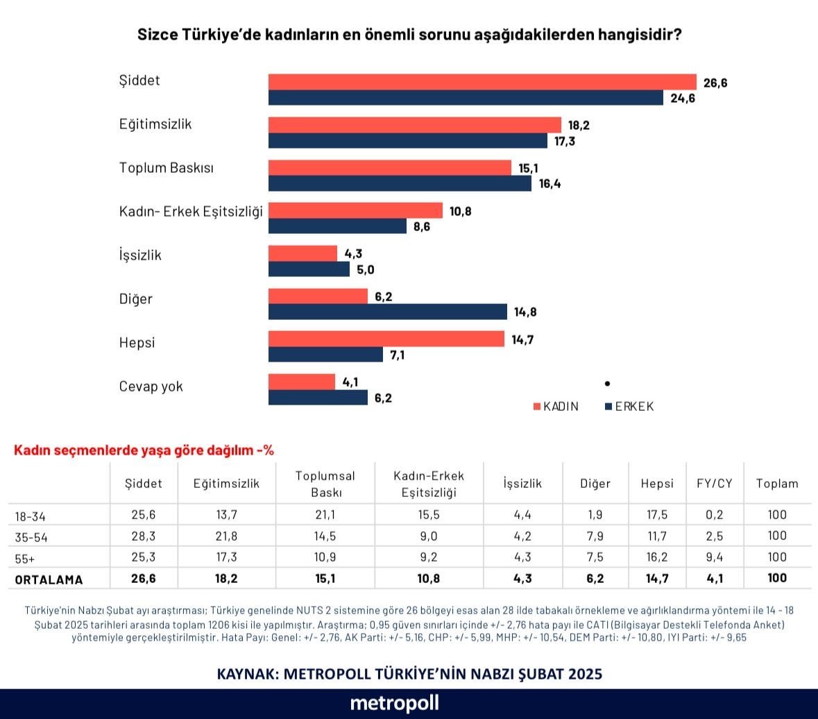 Metropoll’ün Şuba ayı araştırmasına katılan kadınlar Türkiye genelinde kadınların toplum içinde yaşadığı en büyük sorunun şiddet olduğunu belirtti.