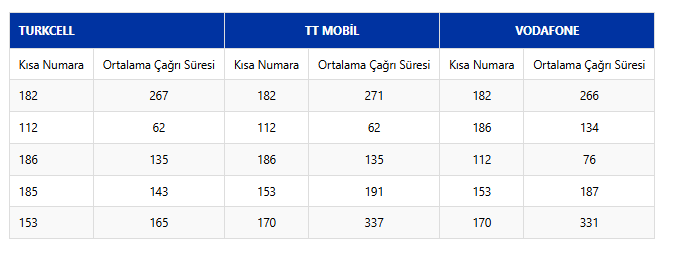Yılın ikinci çeyreğinde, 3 operatörden en sık yapılan 5 kısa numara ve ortalama çağrı süreleri (saniye) ise şöyle: