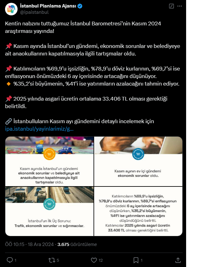 İstanbul Planlama Ajansı (İPA) tarafından hazırlanan İstanbul Barometresi Kasım 2024 raporu, İstanbulluların güncel sorunları ve ekonomik duruma ilişkin görüşlerini ortaya koyarak, şehrin nabzını tutuyor. Raporda katılımcılar, İstanbul’u etkileyen en önemli meselelerin ekonomik sıkıntılar ve trafik sorunları olduğunu vurguluyor.