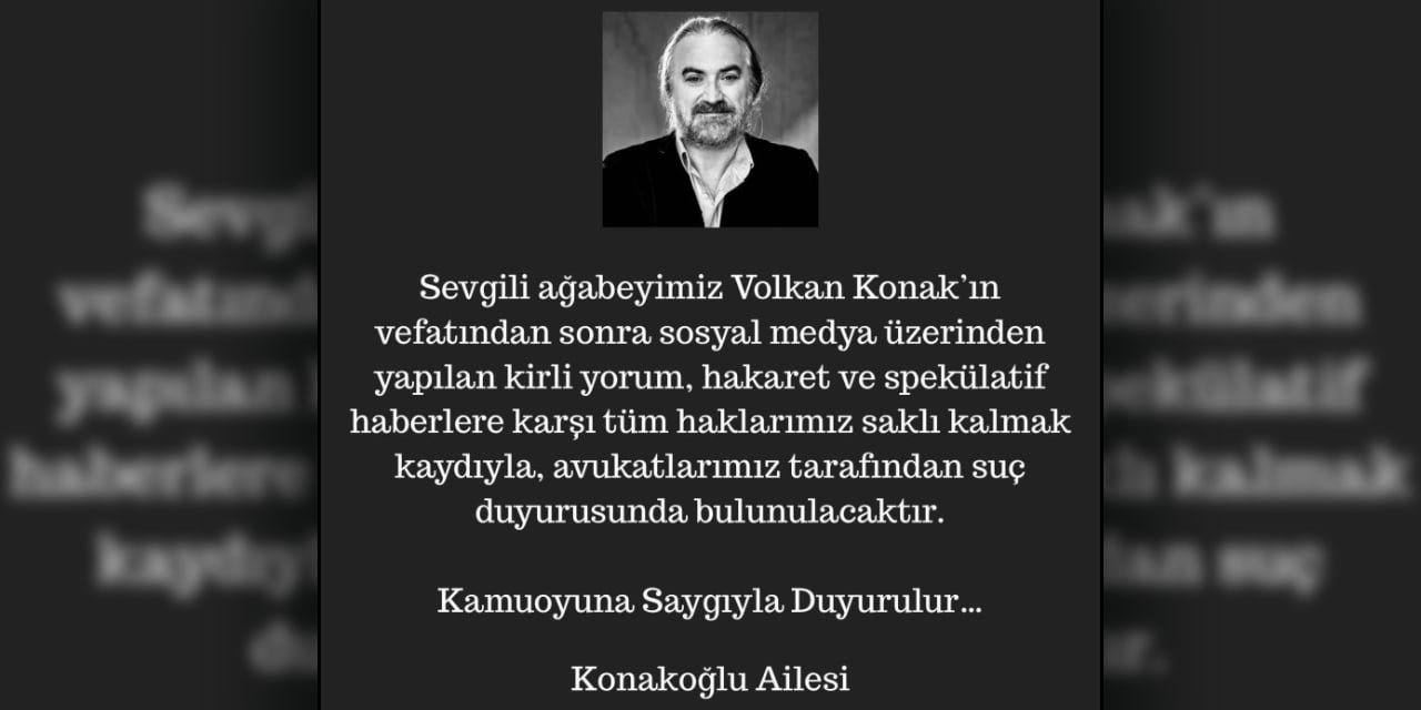 “Sevgili ağabeyimiz Volkan Konak’ın vefatından sonra sosyal medya üzerinden yapılan kirli yorum, hakaret ve spekülatif haberlere karşı tüm haklarımız saklı kalmak kaydıyla, avukatlarımız tarafından suç duyurusunda bulunulacaktır.”