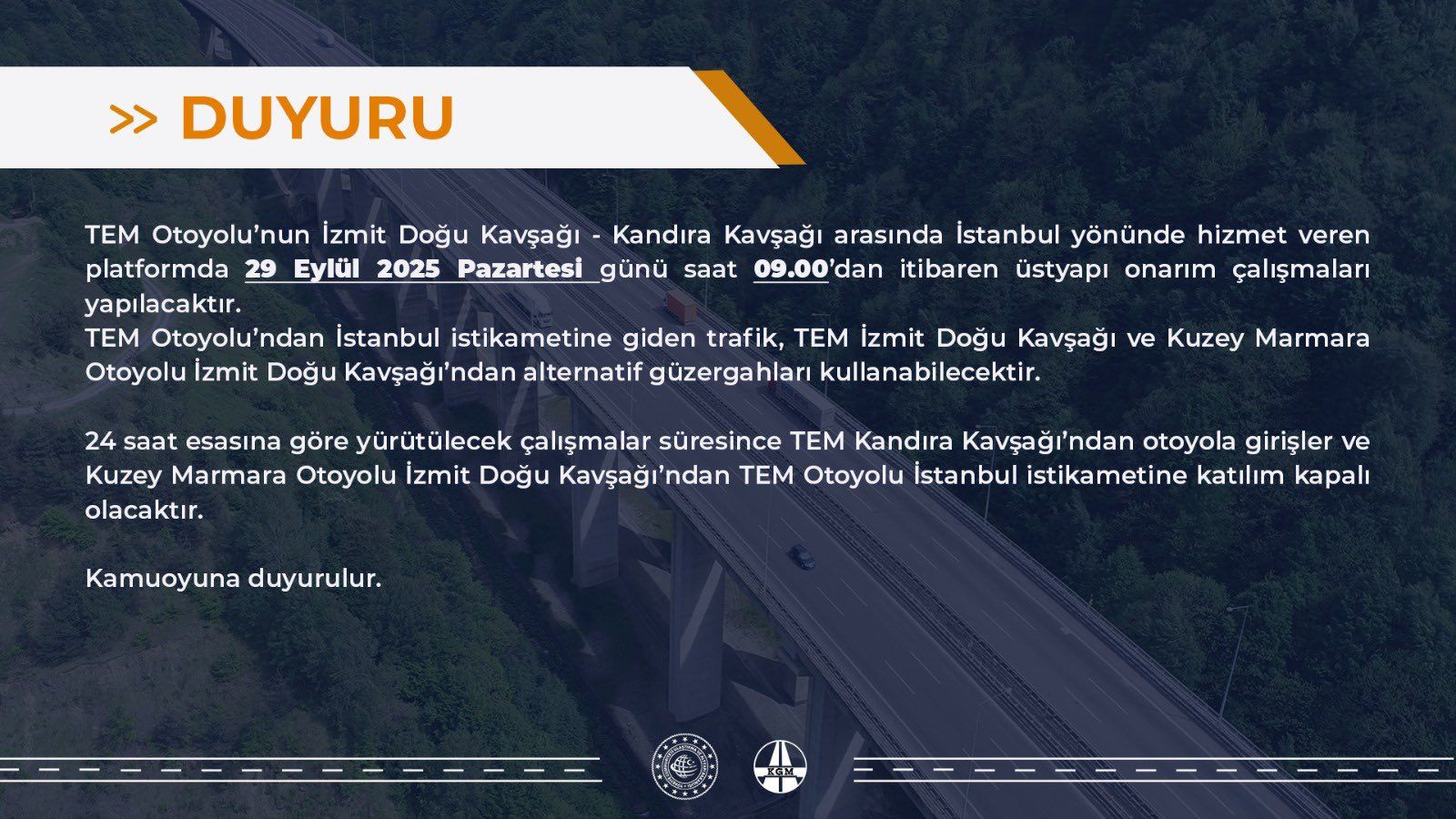 ”TEM Otoyolu’nun İzmit Doğu Kavşağı – Kandıra Kavşağı arasında İstanbul yönünde hizmet veren platformda 29 Eylül 2025 Pazartesi günü saat 09.00’dan itibaren üstyapı onarım çalışmaları yapılacaktır.