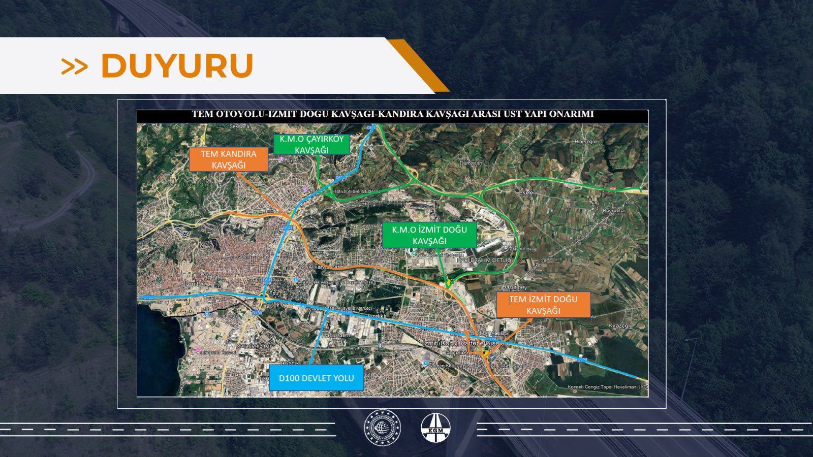 24 saat esasına göre yürütülecek çalışmalar süresince TEM Kandıra Kavşağı’ndan otoyola girişler ve Kuzey Marmara Otoyolu İzmit Doğu Kavşağı’ndan TEM Otoyolu İstanbul istikametine katılım kapalı olacaktır.”