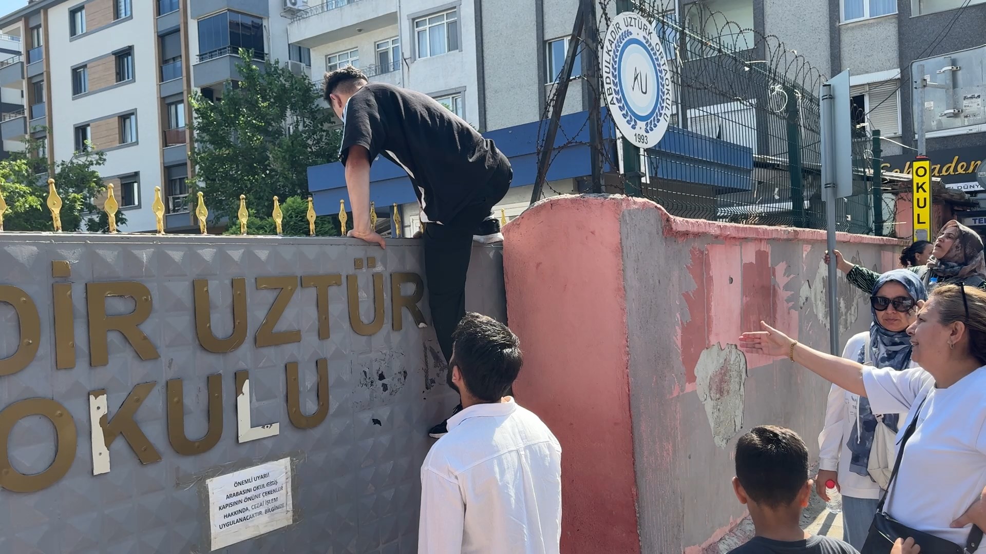 Esenyurt’tan geldiğini söyleyen diğer aday da arkadaşının yardımıyla demir kapıya tırmanmak istedi. Ancak okul bahçesindeki polisi fark edince geri indi.