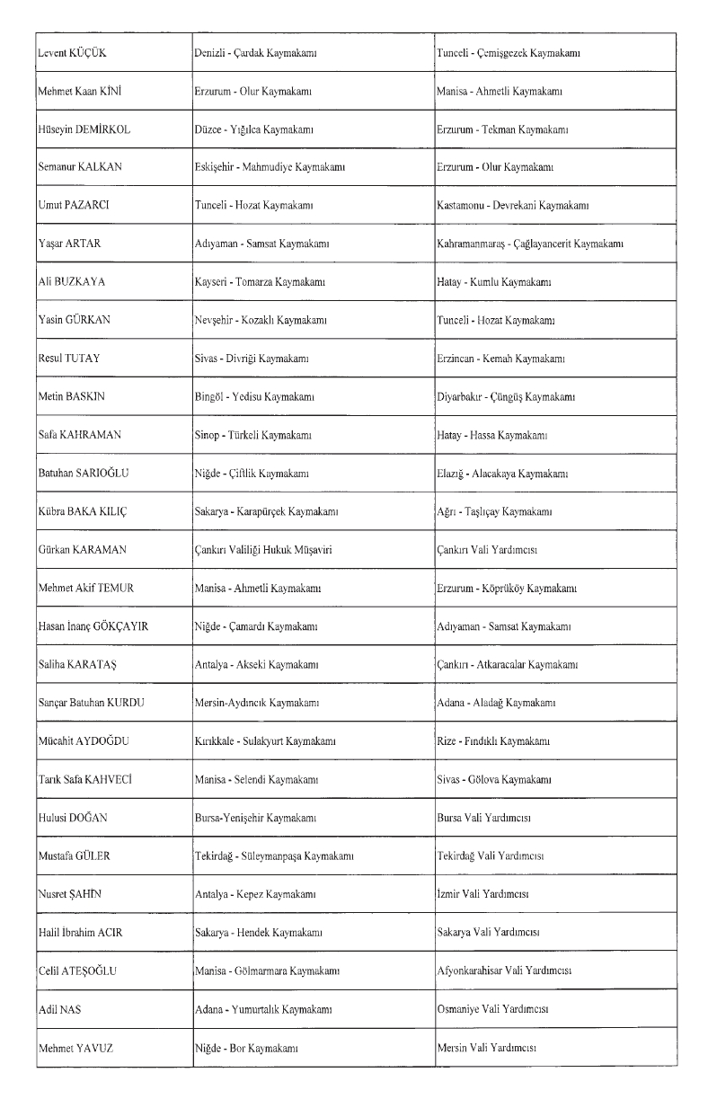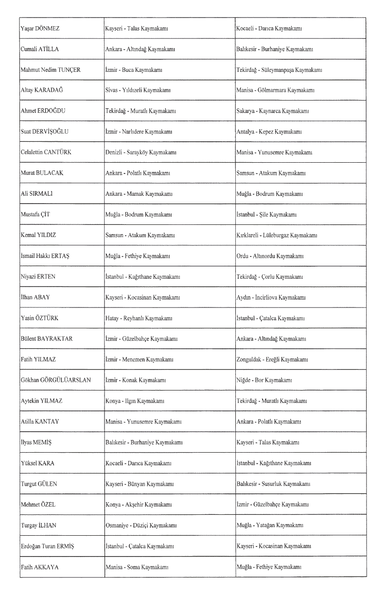 Çok sayıda ilçe kaymakamının görev yeri bir başka ilçeye kaydırıldı. Mevcut görevlerinden Hukuk Müşavirliğine, Vali Yardımcılığına veya Mülkiye Müfettişliğine atanan kaymakamlar da oldu.